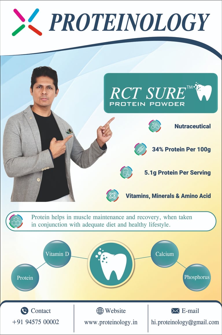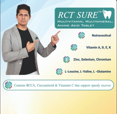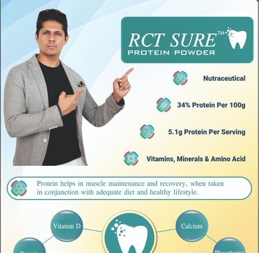 RCT SURE protein powder and multivitamin tablets are developed using scientifically validated ingredients and formulated in accordance with established nutritional and clinical guidelines by FSSAI.Each component is quality tested for safety, purity, and consistency, and the formulation is designed to support healing, recovery, and oral tissue health in dental patients.